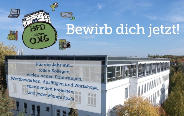 Wenn ihr Interesse an einem Bundesfreiwilligendienst am ONG habt, ist der erste Schritt die Bewerbung beim externen Träger Demokratie & Dialog e.V., der mit unserer Schule kooperiert. Bei diesem leistet ihr nämlich den Dienst ab, die Schule ist dann eure Einsatzstelle, aber nicht euer Arbeitgeber. Bewerben könnt ihr euch ab Anfang jedes neuen Kalenderjahres hier.