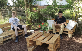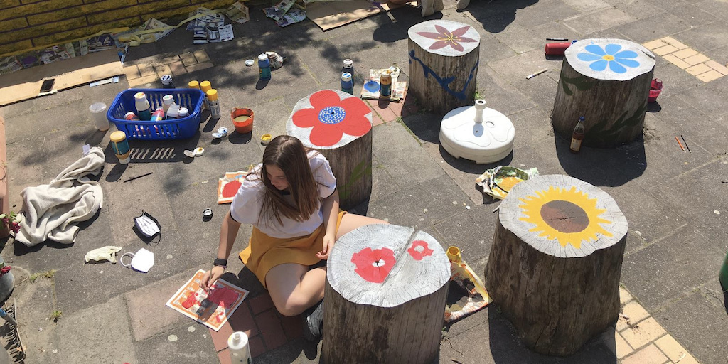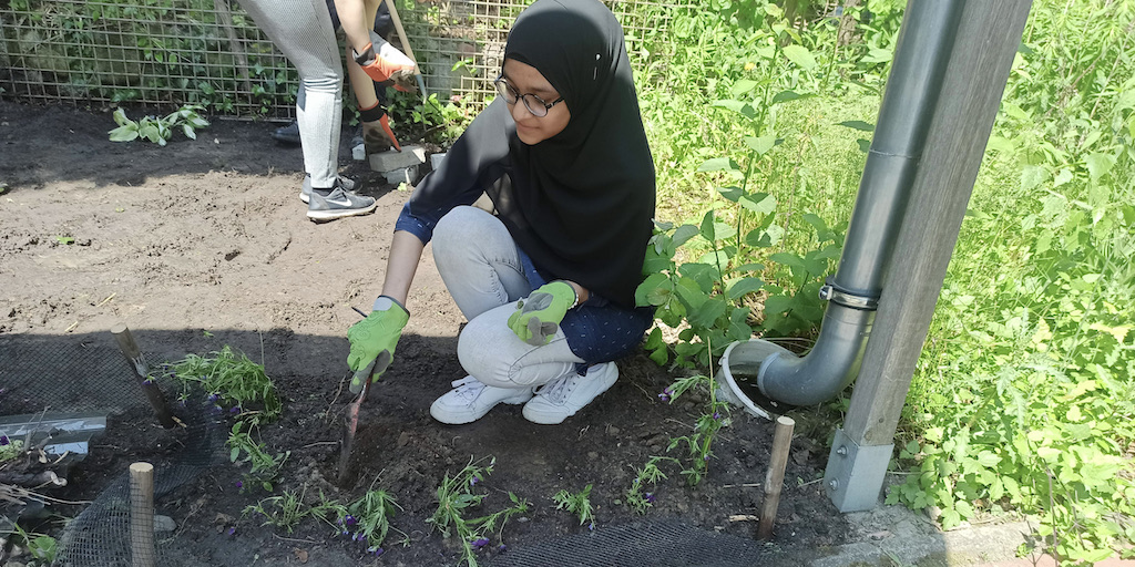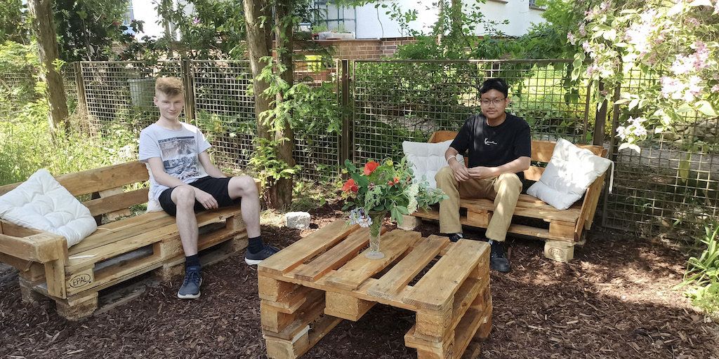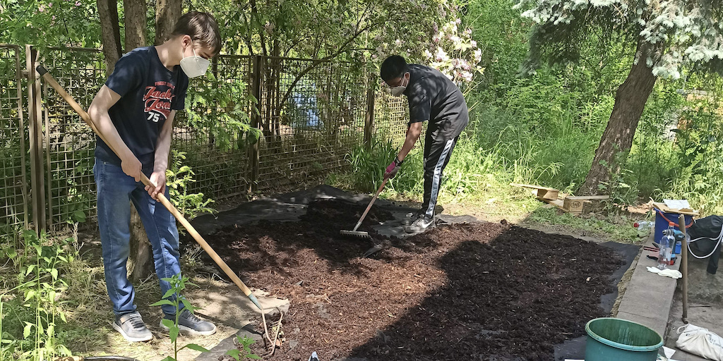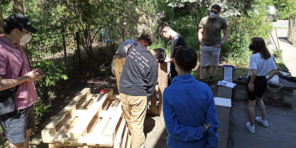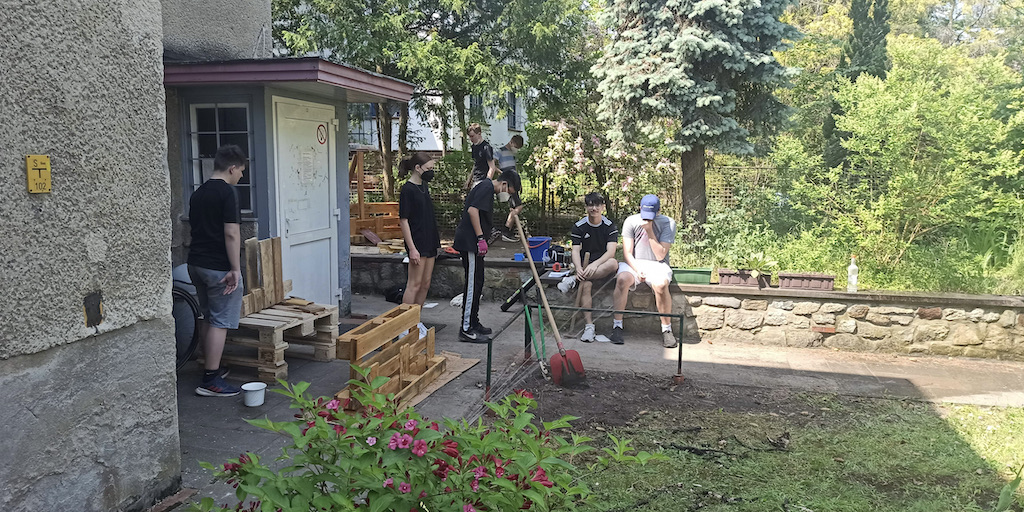 Zusammen arbeiteten fünf Gruppen, die verschiedene Berufsbilder repräsentierten, an der Verschönerungen des Gartens im Treppenhaus.