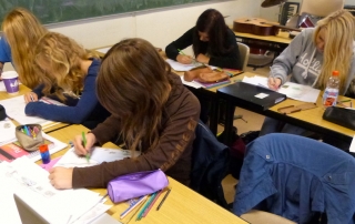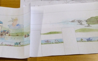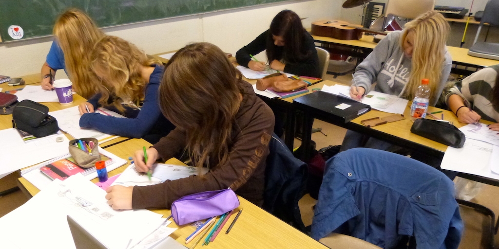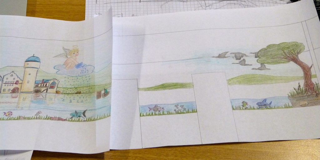 Jeder Schüler fertigte einen farbigen Entwurf mit vielen Details an. Die Auswahl des Motivs, welches dann umgesetzt wird, treffen die Bewohner der Heime.