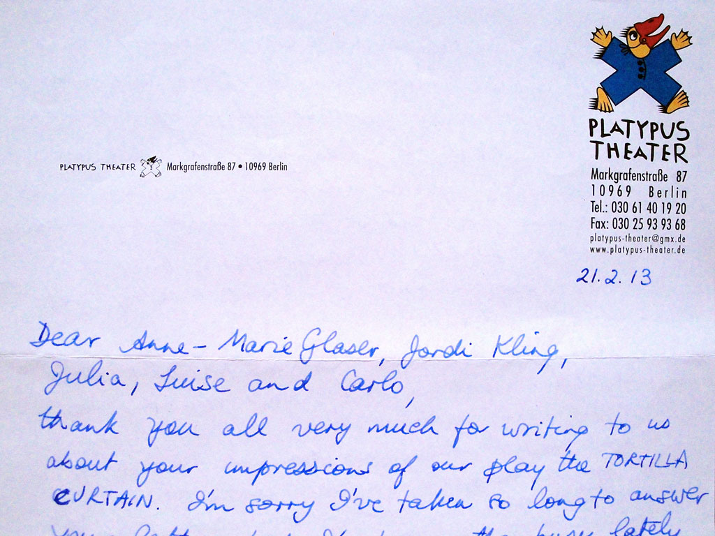 Der Grundkurs erhält ein persönliches Antwortschreiben auf ihre Rezension vom Leiter der Theatergruppe Platypus.