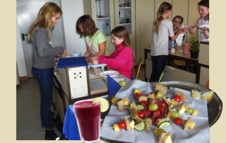 Viel interessanter ist dann die Umsetzung. So wurde in einem Unterrichtsblock geschnitten, geschmiert, gerührt, gemixt, serviert und begutachtet. Es entstanden Doppeldecker – Sandwich, Smoothies, Obstspieße uvm.. Verkostet und bewertet wurde von den Schülern selbst.