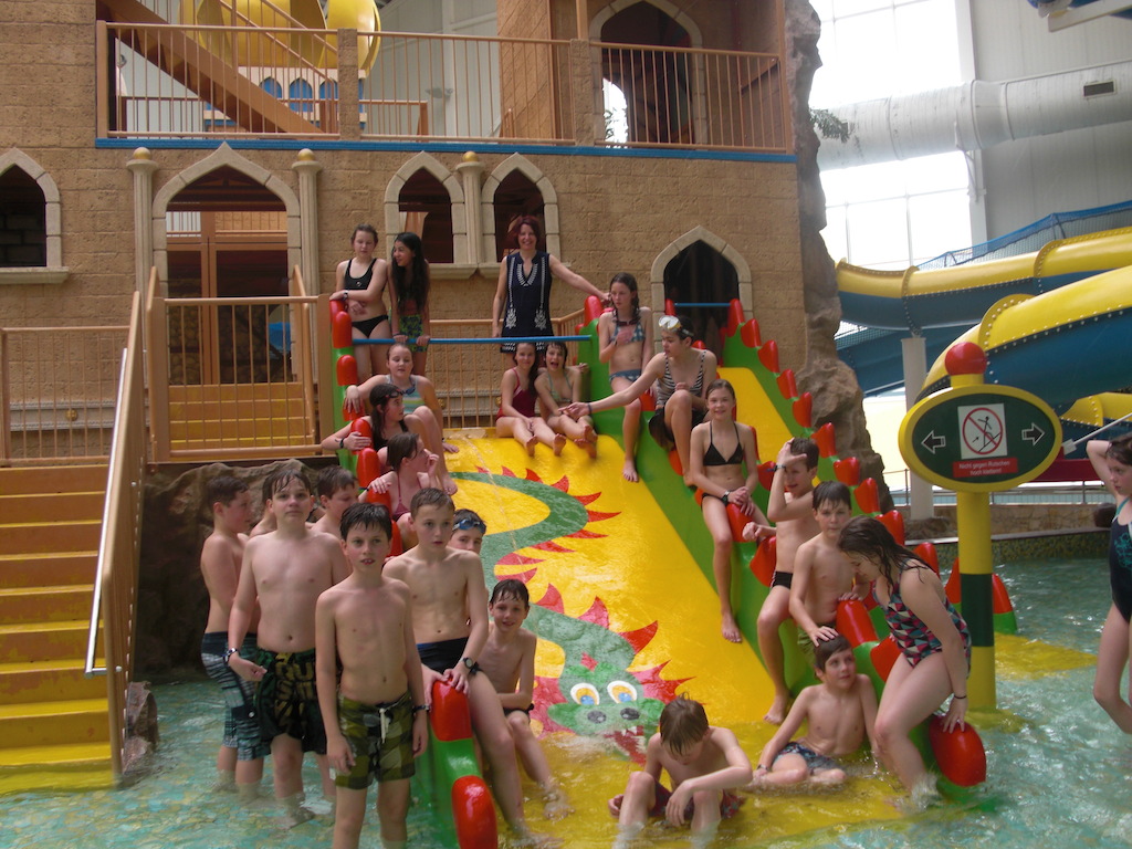 Gestern wurde ein Wandertagswunsch der Klasse 6.1 erfüllt. Es ging ins Spaßbad „Schwapp“ nach Fürstenwalde mit S-, Regionalbahn und Bus. Auf den Nah- und Regionalverkehr war Verlass. Pünktlich zum Einlassbeginn waren wir dort und hatten das Glück, das ganze Bad fast für uns allein zu haben. Wir waren die einzige Klasse und hatten Riesenspaß im Wasser und zu Land. Gute 3 Stunden konnten wir uns austoben auf der Riesenrutsche mit Reifen, bei den stündlichen Wellenbrausen, im Außenterrain und im Whirlpool. Das machte Appetit und gute Laune.