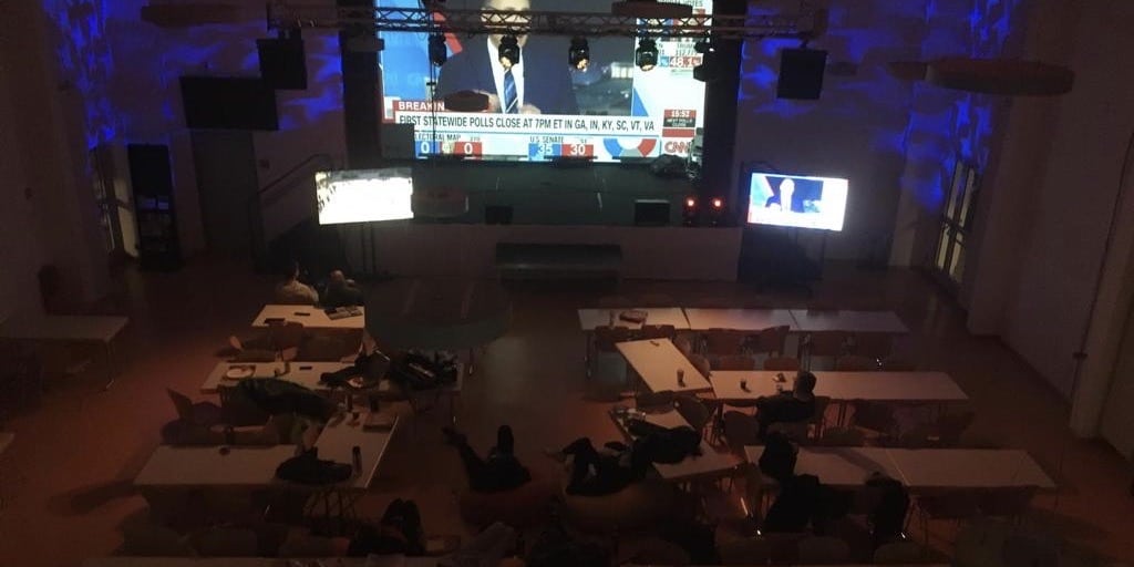 Unter Einhaltung der Hygienemaßnahmen war es dem Leistungskurs Englisch von Herrn Tietz möglich, einen Abend in der Aula zu übernachten, um sich die US-Wahl live anzusehen.