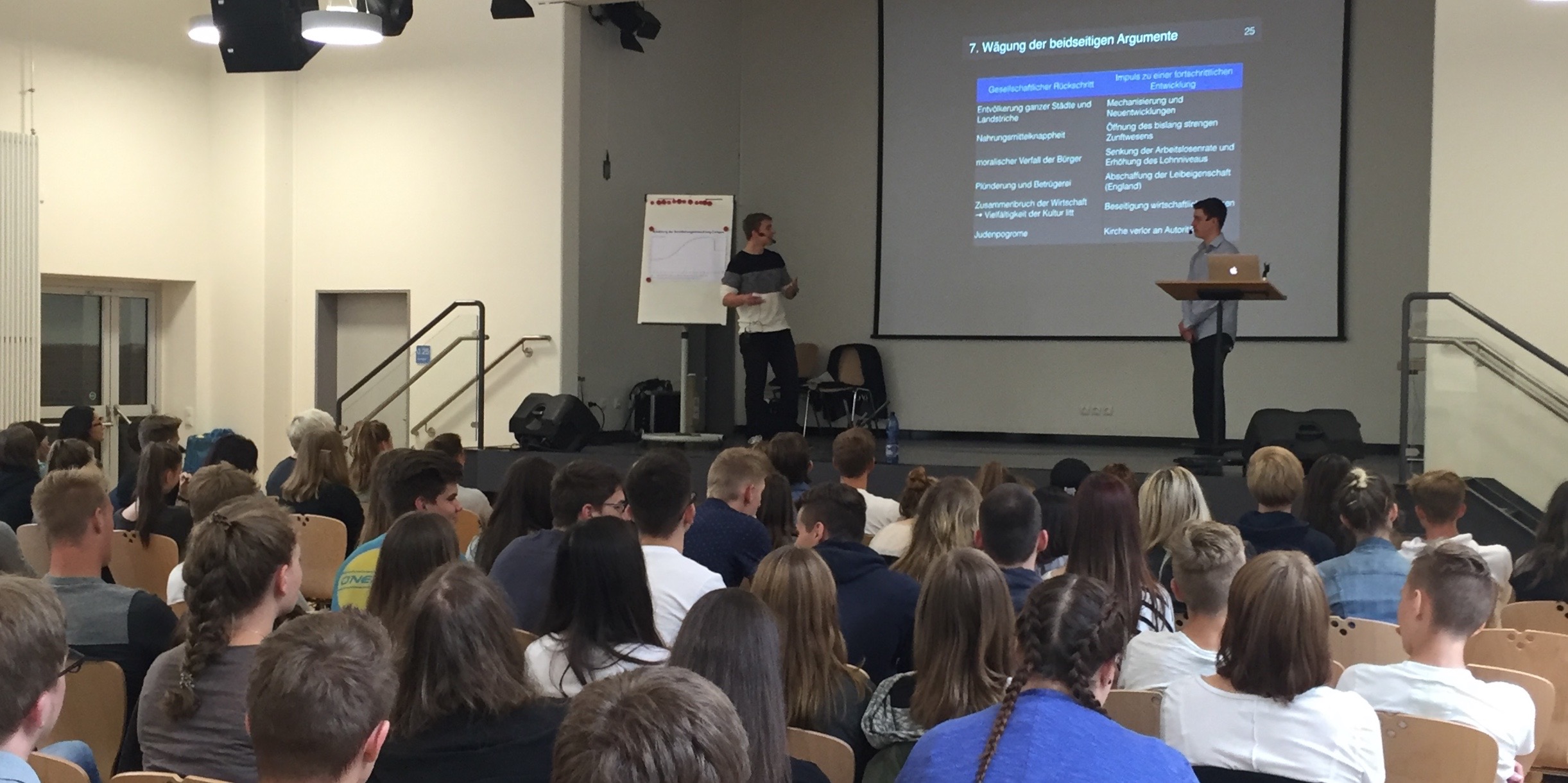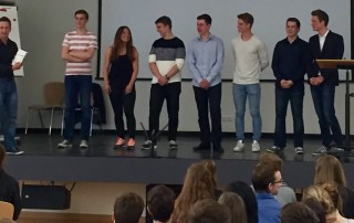 Sieben Referenten des zwölften Jahrgangs präsentierten ihre Präsentationen ihrer 5. Prüfungskompetente vor Schülern und Lehrern.