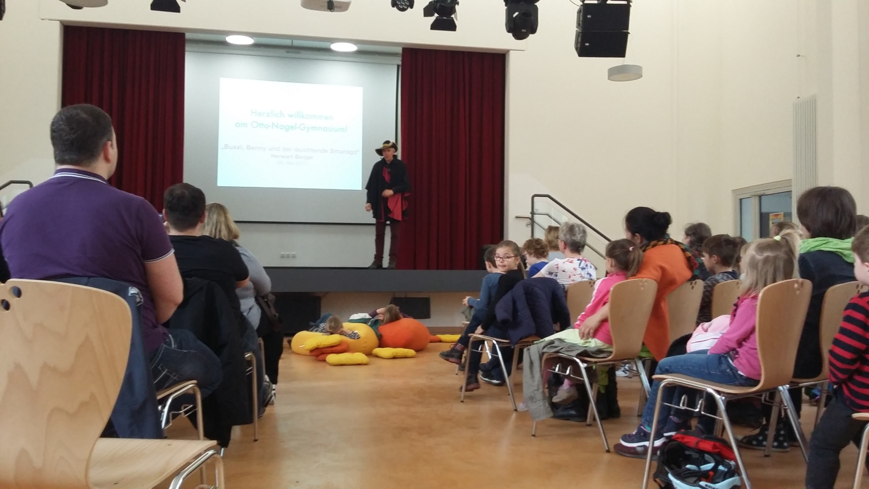 Knisternde Spannung lag in der Luft als der Kinderbuchautor Herwart Berger verkleidet die Bühne betrat und von den Abenteuern des Wurzelmännchens Buxel zu erzählen begann...