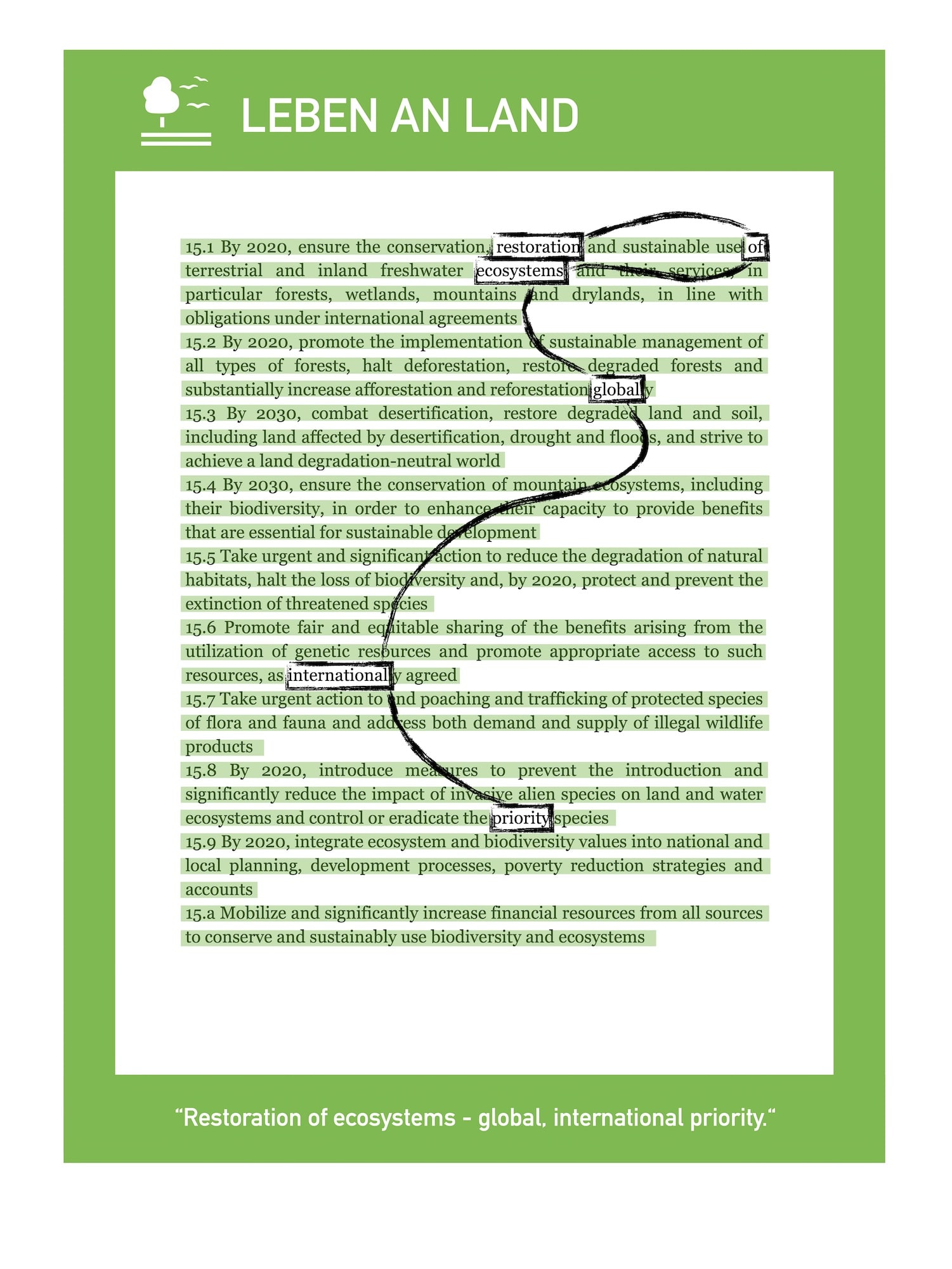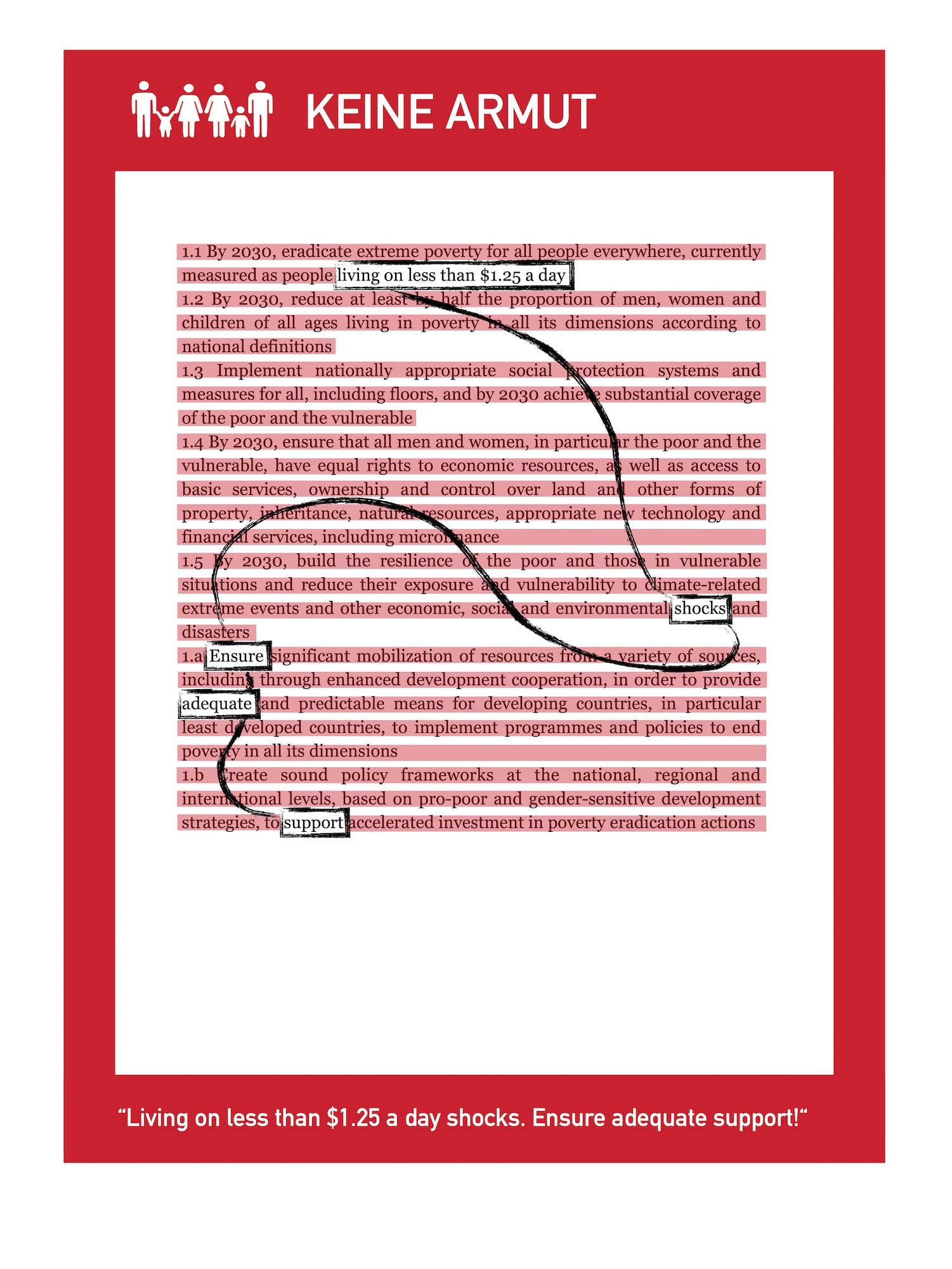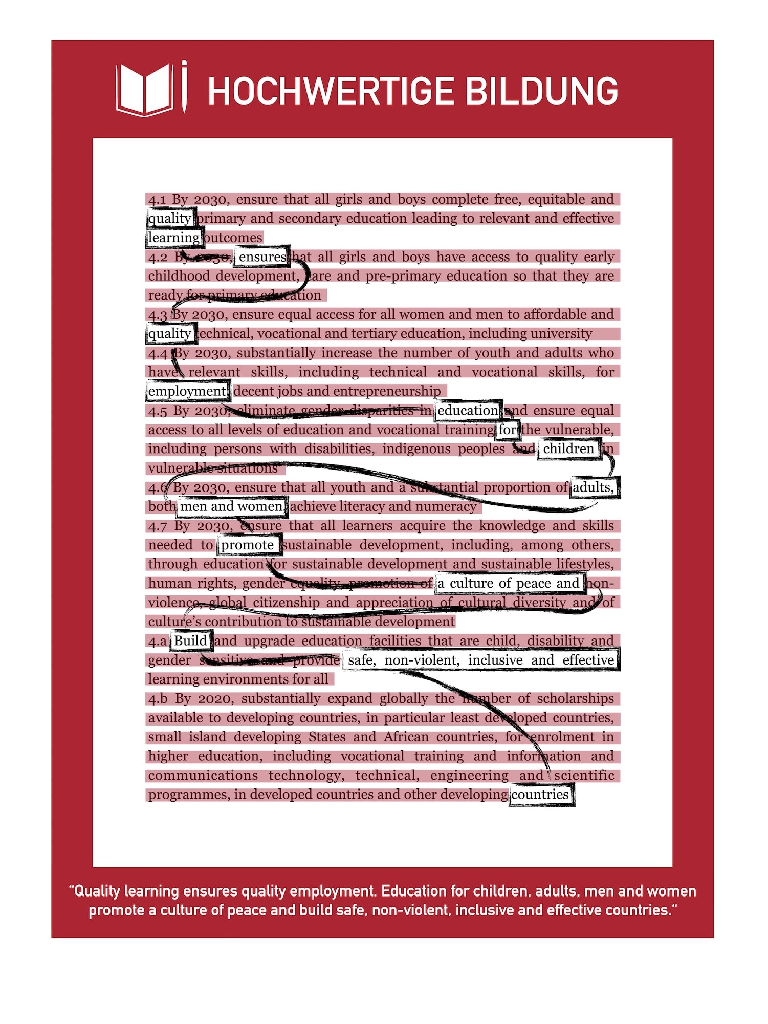 Wir haben uns vertieft mit den 17 Zielen für eine nachhaltige Entwicklung auseinandergesetzt. Dabei haben wir die englischen Erklärungen der Nachhaltigkeitsziele künstlerisch umgesetzt. Wir haben die Methode „Blackout Poetry“ auf die 17 Ziele angewandt, d.h. einzelne Worte wurden hervorgehoben und zu einer neuen (poetischen) Bedeutung kombiniert. Dadurch sind einprägsame Sätze entstanden, die zum Nachdenken anregen, kritisieren und die Ziele darstellen.