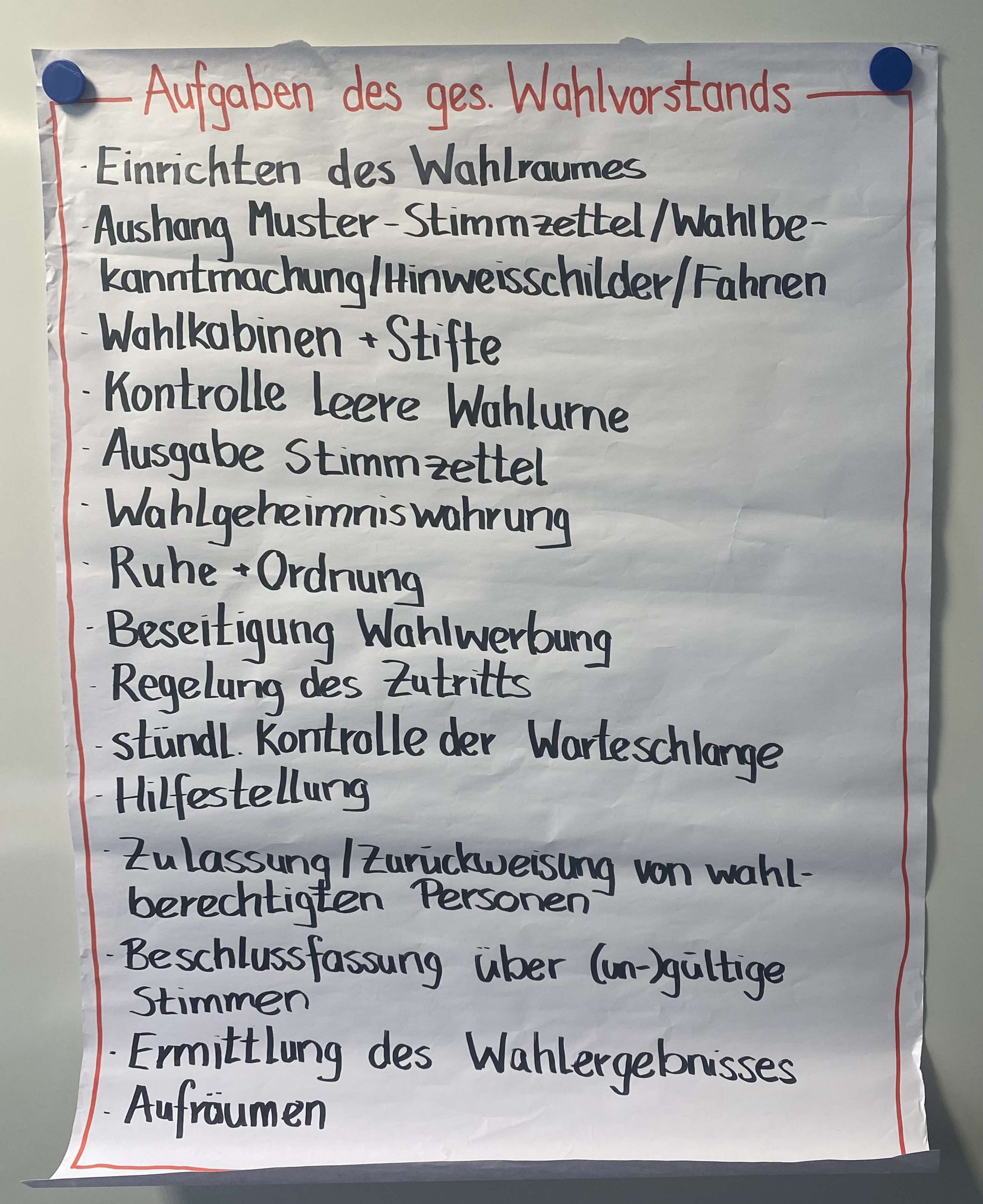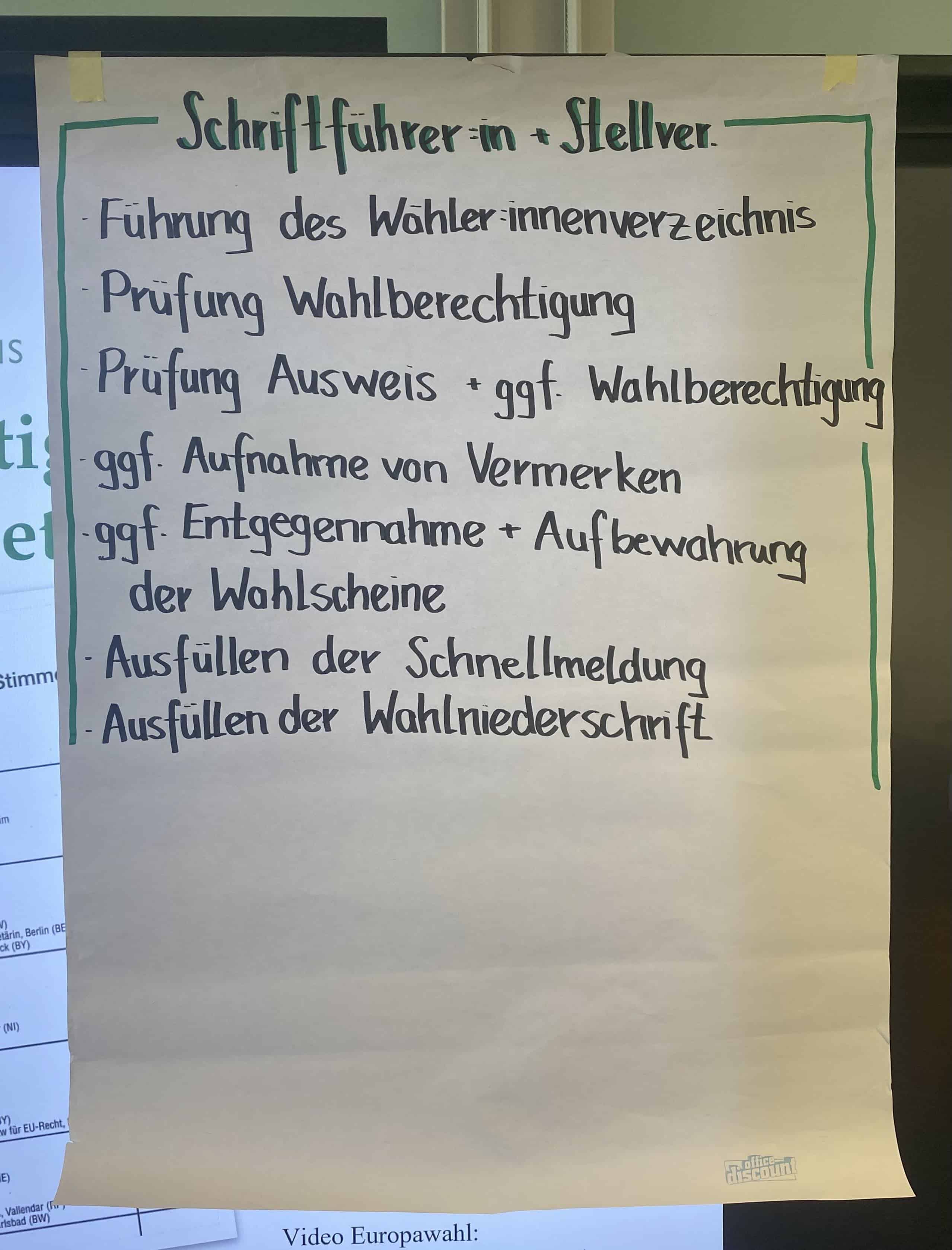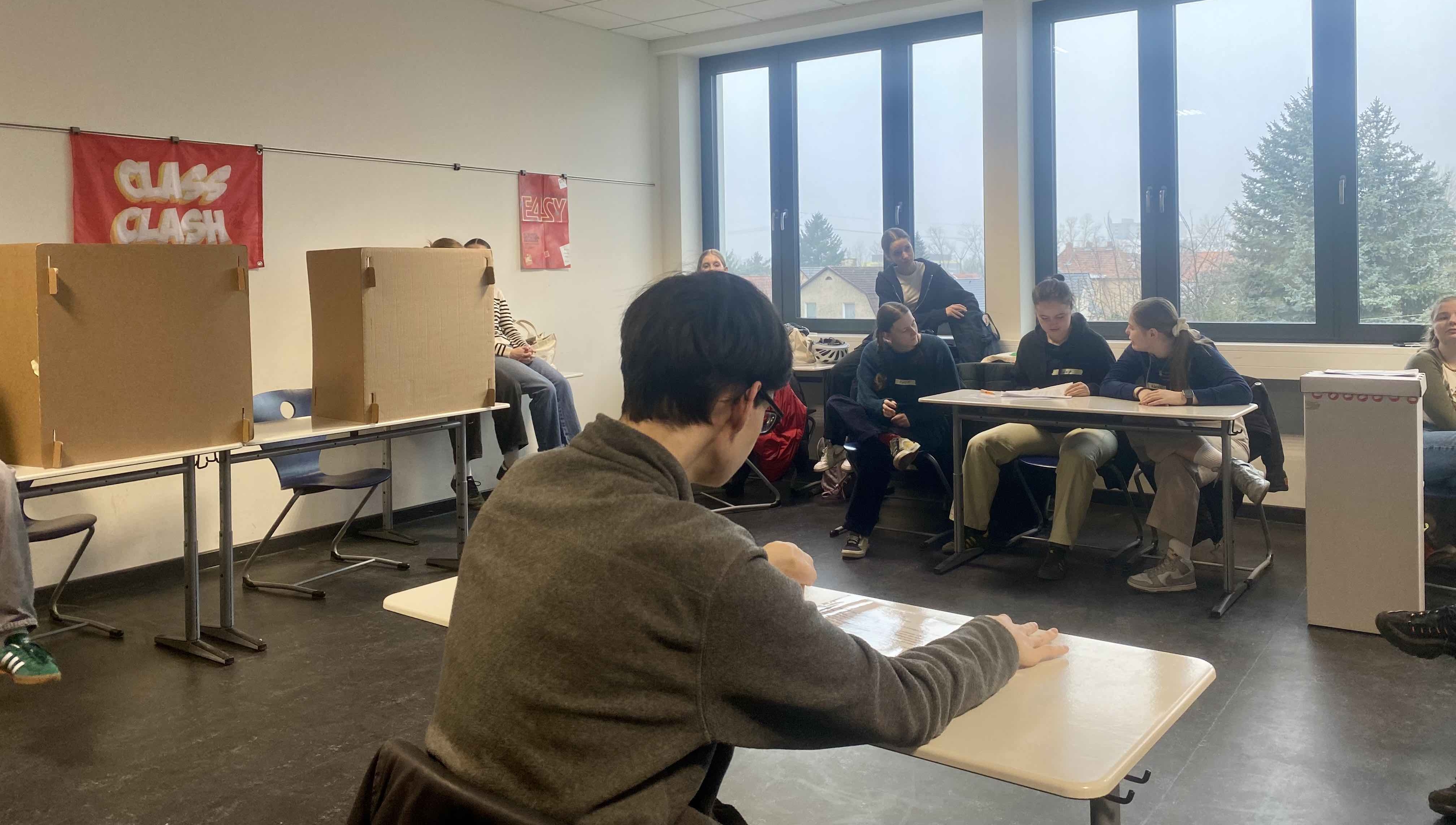 Am zweiten Tag ging es dann um unsere praktischen Rollen bei der Wahl. Zunächst machten wir uns mit den Aufgaben eines idealen Wahlhelfenden vertraut: Hilfsbereit, geduldig, organisiert und aufgeschlossen sollte der ideale Erstwahlprofi sein. Anschließend verwandelten wir den Klassenraum in ein Wahllokal, um den Ablauf am Wahltag zu simulieren. Dabei nahm jede Person immer die unterschiedlichen Rollen der Wahlhelfer*innen sowie Wähler*innen ein.