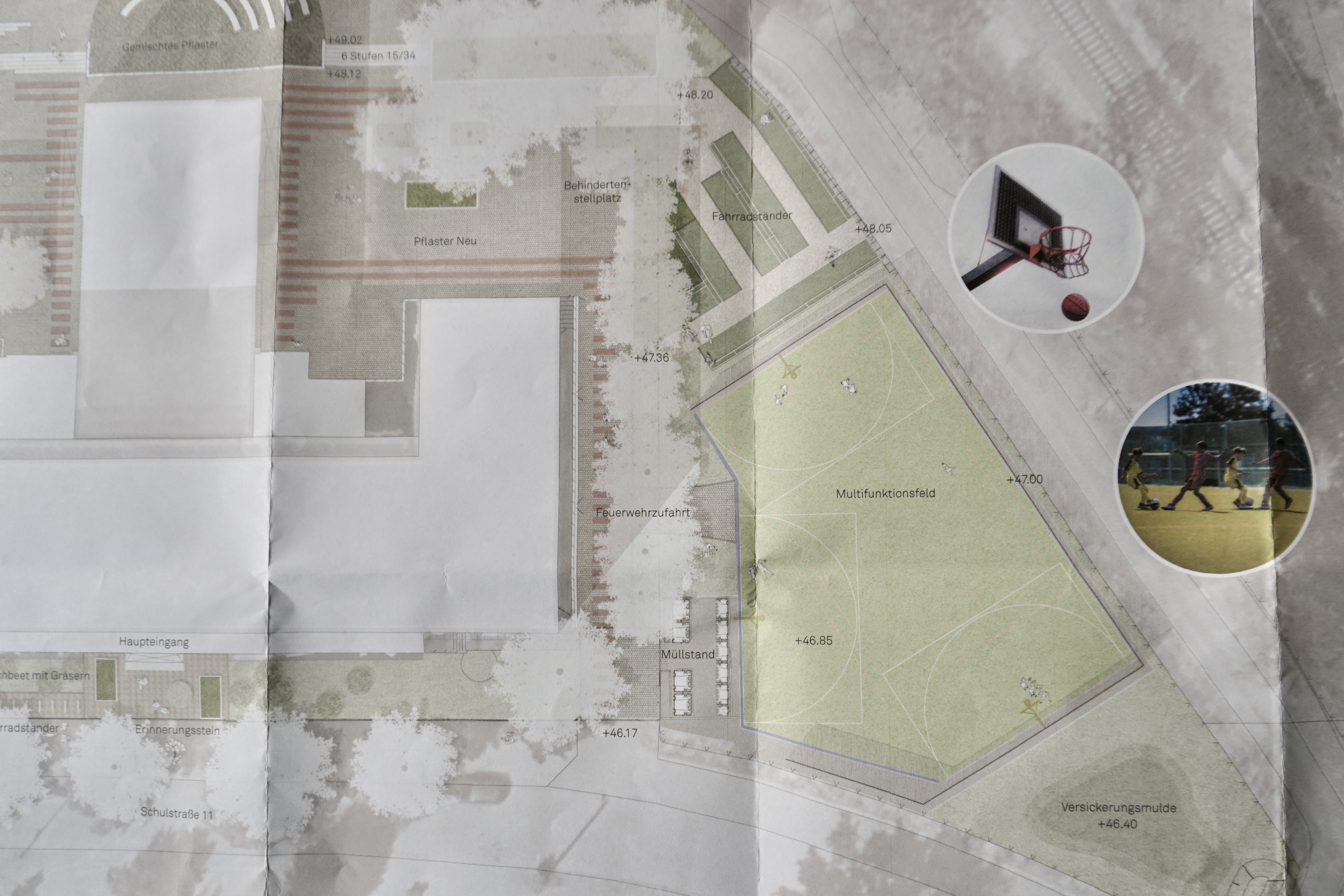 Die bisher ungenutzte östliche Grünfläche zwischen Schienen und Schule wird zu einem Multifunktionsfeld umgestaltet. Auf diesem Multifunktionsfeld gibt es drei Basketballkörbe und Fußballtore.