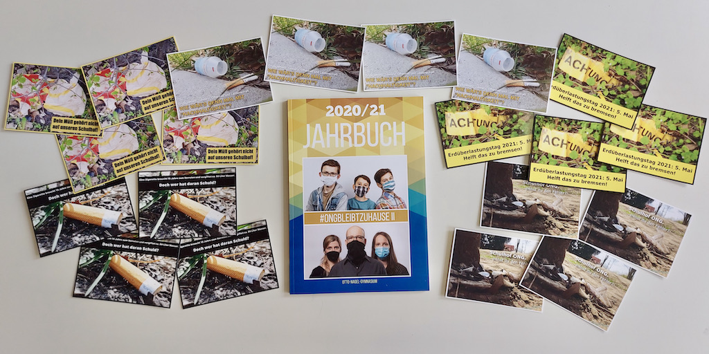 In diesem Jahr befindet sich in jedem Jahrbuch eine Postkarte zum Thema Nachhaltigkeit. Die Karten wurden von der Klasse 7.1 erstellt und erinnern daran, dass wir gemeinsam in der Pflicht stehen, Müll zu vermeiden und nicht achtlos auf dem Schulhof liegen zu lassen.