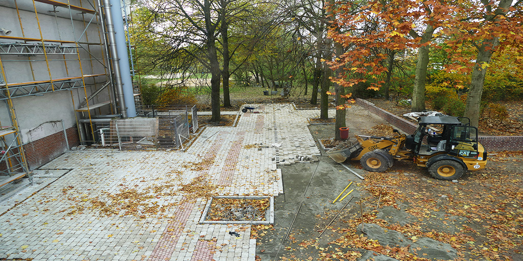 Es werden innerhalb von zwei Wochen 150t Beton abgerissen. Bis zum 21.10. werden neue Mauern im Norden der Aula und bis zum 21.11. neue Wege errichtet.