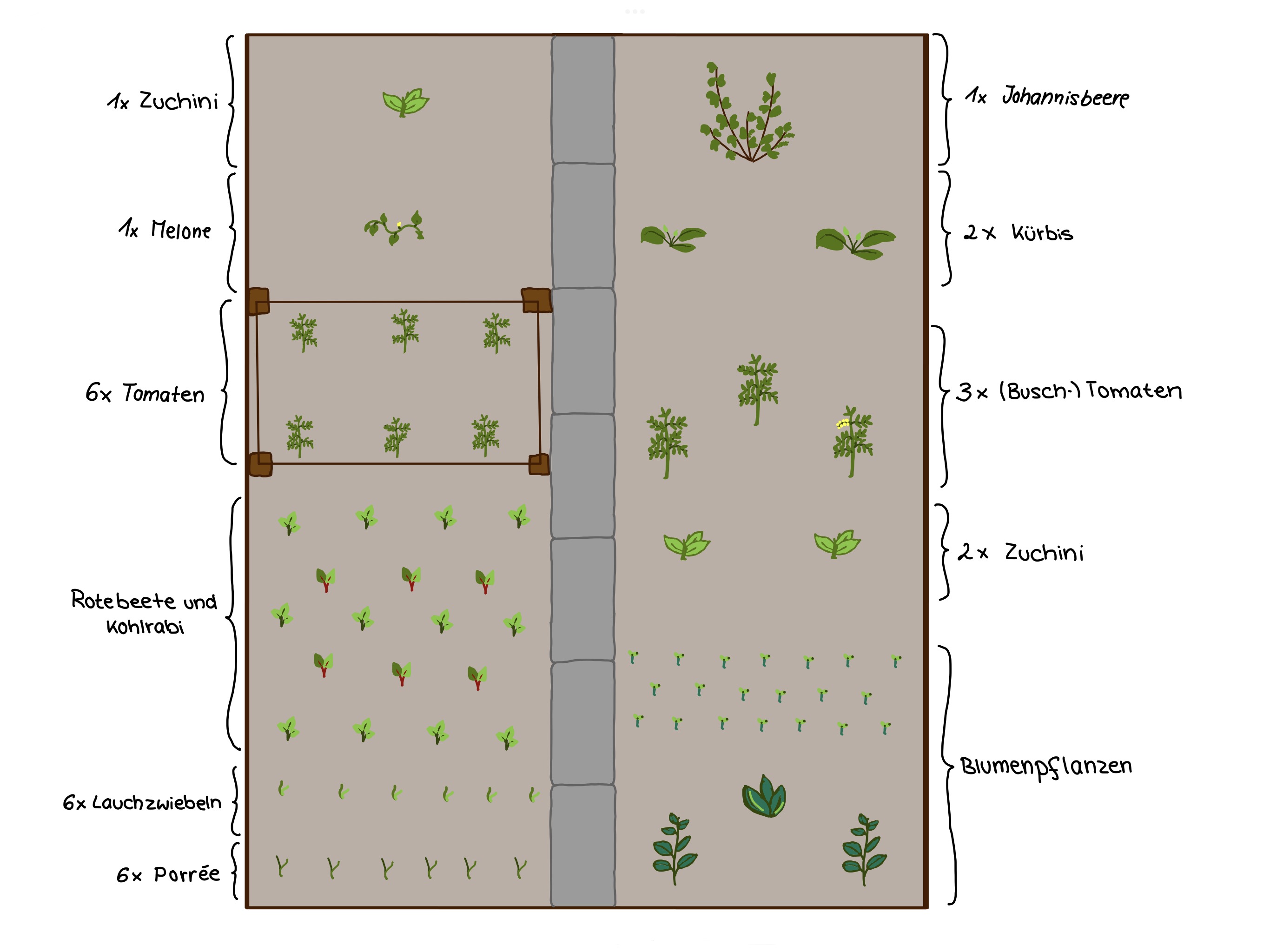 Unsere Beete bestehen nun aus mehreren Schichten. Zunächst kommt eine Schicht aus Holz und Geäst. Die zweite Schicht besteht aus altem Laub und Pflanzenschnitt. Als letztes haben wir noch alles mit guter Muttererde zugedeckt. Die unteren Schichten spenden durch das Verrotten Wärme und Nährstoffe. Dies ist einen perfekte Grundlage für die Pflanzen, die wir dann eingesetzt haben. Diese haben wir in einer Art Mischkultur angelegt. Die Mischkultur ist der Gegensatz zur Monokultur und besteht aus mehreren Pflanzen. Unter anderem befinden sich in unserem Beet nun bienenfreundliche Pflanzen, Tomaten und Zucchini. Einen genaueren Plan findet ihr ebenfalls in diesem Artikel, zusammen mit ein Paar Fotos.
