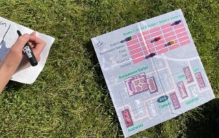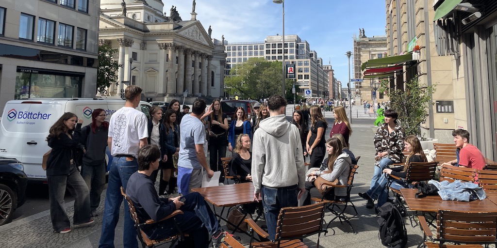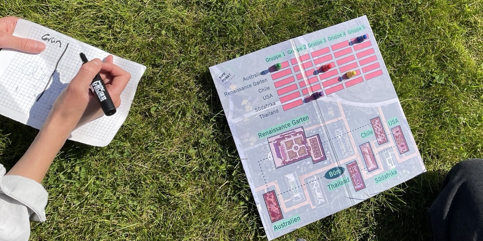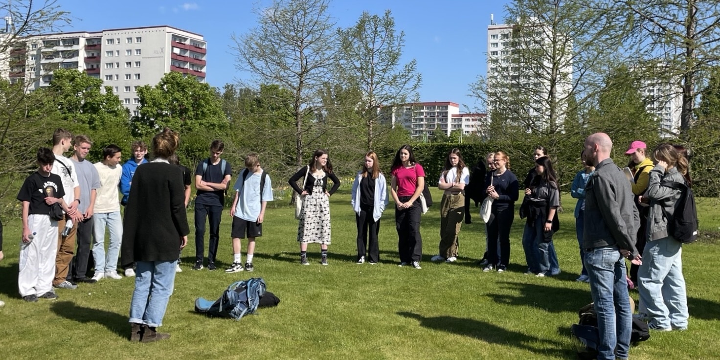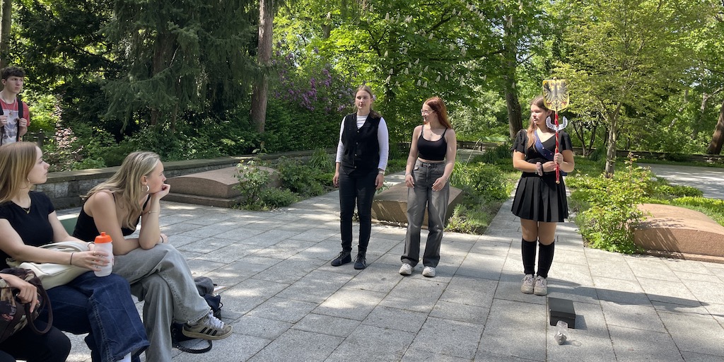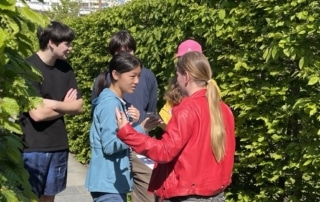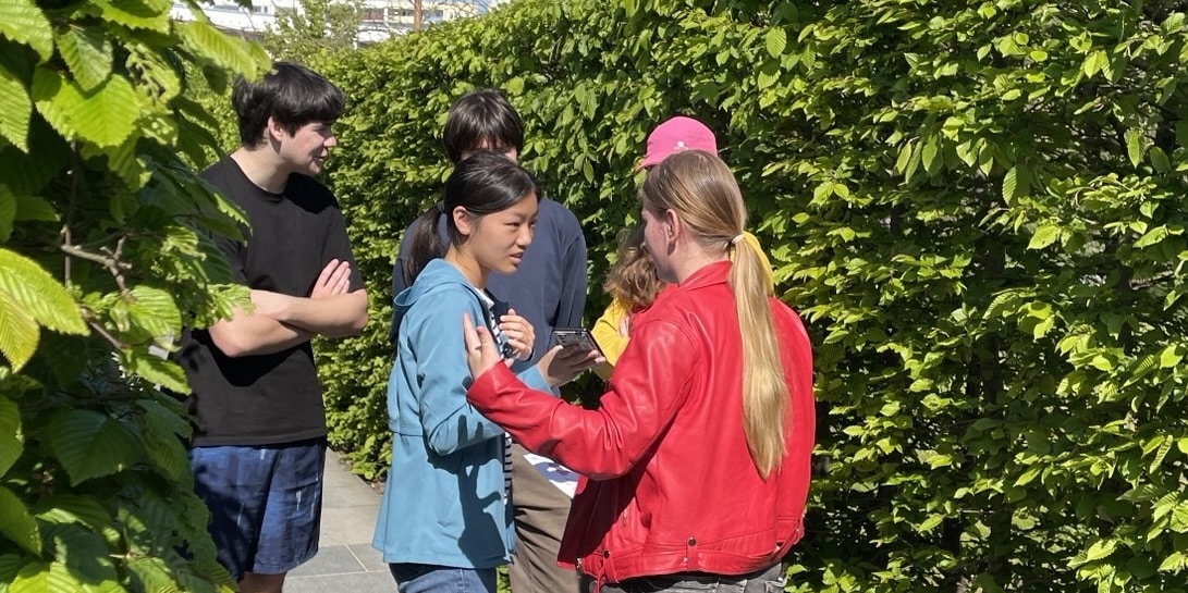 So mussten wir zunächst in kleinen Gruppen als Detektive durch die verschiedenen Gärten der Welt ziehen, Umschläge suchen und die Aufgaben darin bearbeiten. Im Garten Thailands waren beispielsweise die unterschiedlichen Auswirkungen des Klimawandels auf die unterschiedlichen Gesellschaftsschichten ein Thema. In Chile diskutierten wir über buen vivir und in Südafrika über den Kolonialismus. Wir hörten uns Sprachnachrichten an und mussten diese beantworten. Alle Antworten gingen per WhatsApp an das „Detektivbüro“, das unsere Lösungen auswertete und uns zum nächsten Ort schickte. Dies alles erfolgte digital über das Smartphone.