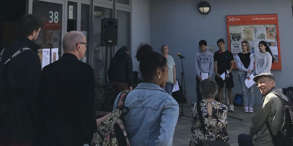 In der Friedrichstraße stellte eine Gruppe einen Schusswechsel nach, die resultierenden „Leichen“ wurden vor der Kirche feierlich aufgebahrt. Sogar eine Passantin gesellte sich dazu und lauschte unserem Vortrag.