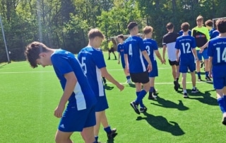 Im vierten Spiel gegen die immer stärker werdenden Jungs der Best-Sabel-Grundschule war es wieder Lian, der mit seinem Tor für unsere Führung sorgte. Leider konnten wir trotz guter Möglichkeiten nicht nachlegen. Und kurz vor Schluss musste der starke Torhüter Kolja doch hinter sich greifen. Obwohl er den Schuss erst stark abwehrte, kullerte dieser im Fallen noch unglücklich hinter die Linie. Auch wenn alle noch einmal den Vorwärtsgang eingeworfen haben, bliebe es beim zweiten Unentschieden für uns.