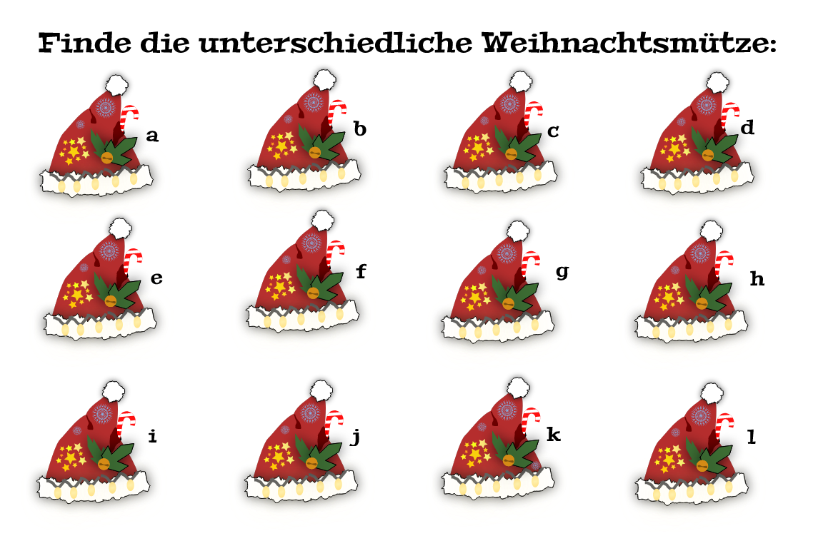 Am heutigen Tag gibt es 12 Weihnachtsmützen. Bei einer ist jedoch ein Fehler unterlaufen und sie sieht anders aus als der Rest.
