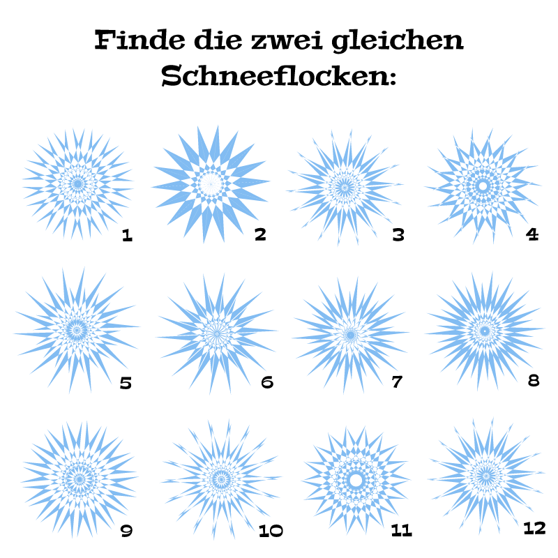 Hier seht ihr ein Bild auf dem alle Schneeflocken unterschiedlich sind, bis auf zwei, welche?