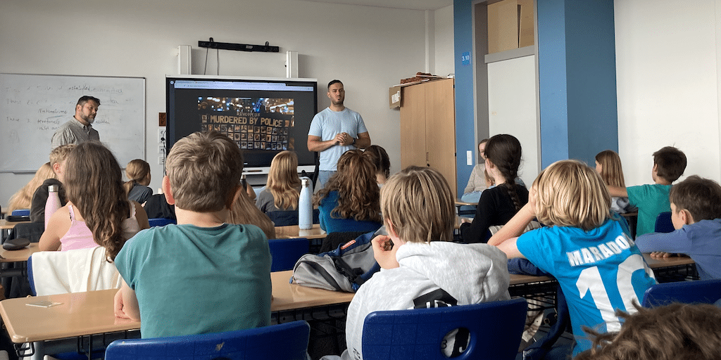 Wir als Friedenstauben setzen uns aktiv dafür ein, unsere Mitmenschen zum offenen und friedlichen Miteinander zu motivieren. Um diese Konversation anzustoßen, haben wir auch in diesem Jahr mit meet2respect kooperiert und den „Respekt verbindet!“-Unterrichtsbesuch am 04. Oktober im 6. Jahrgang organisiert. Sehr gefreut haben wir uns über zwei bekannte Gesichter, denn auch dieses Jahr wurde der Besuch vom Polizisten Koray und dem Imam Ender durchgeführt.